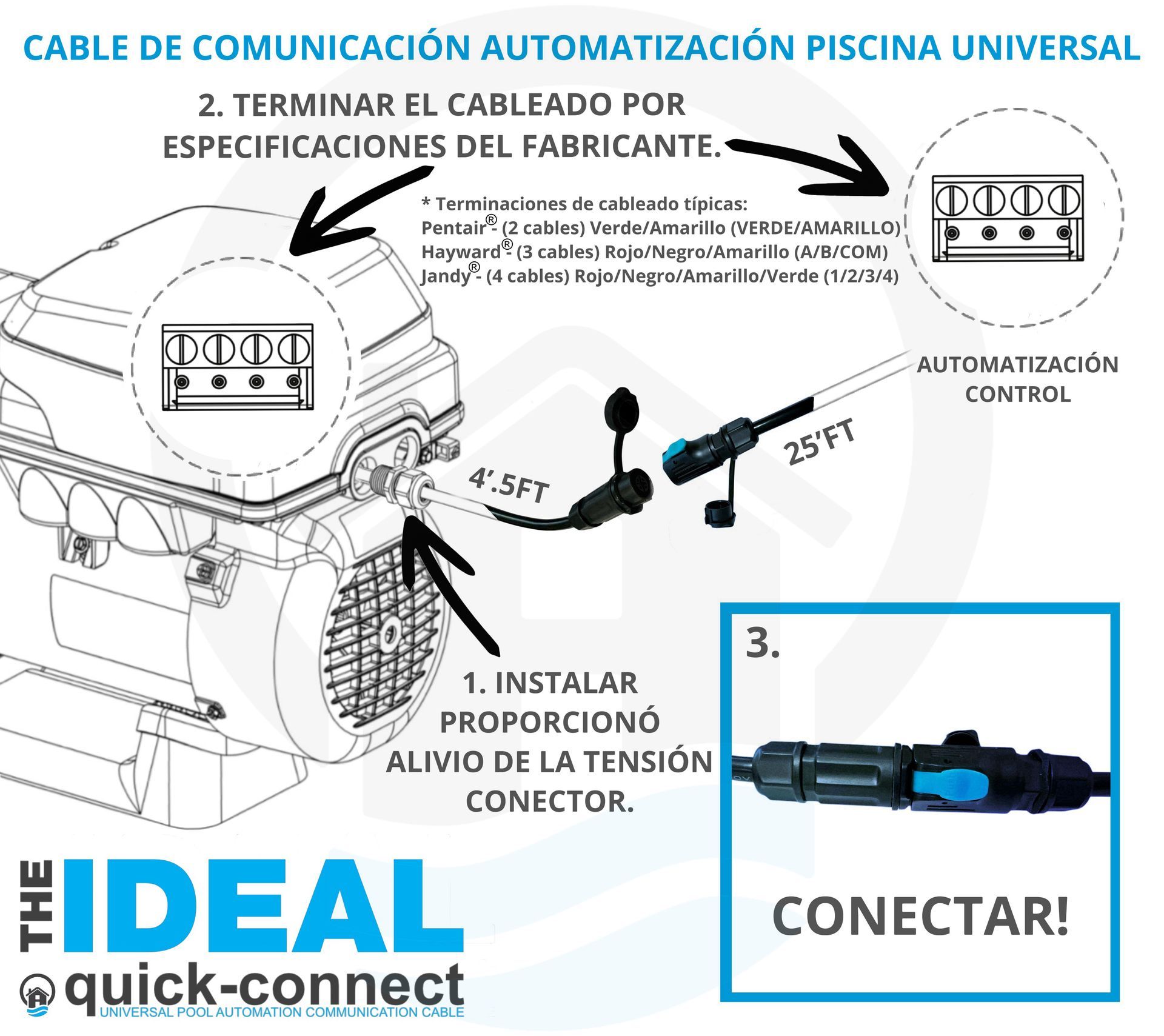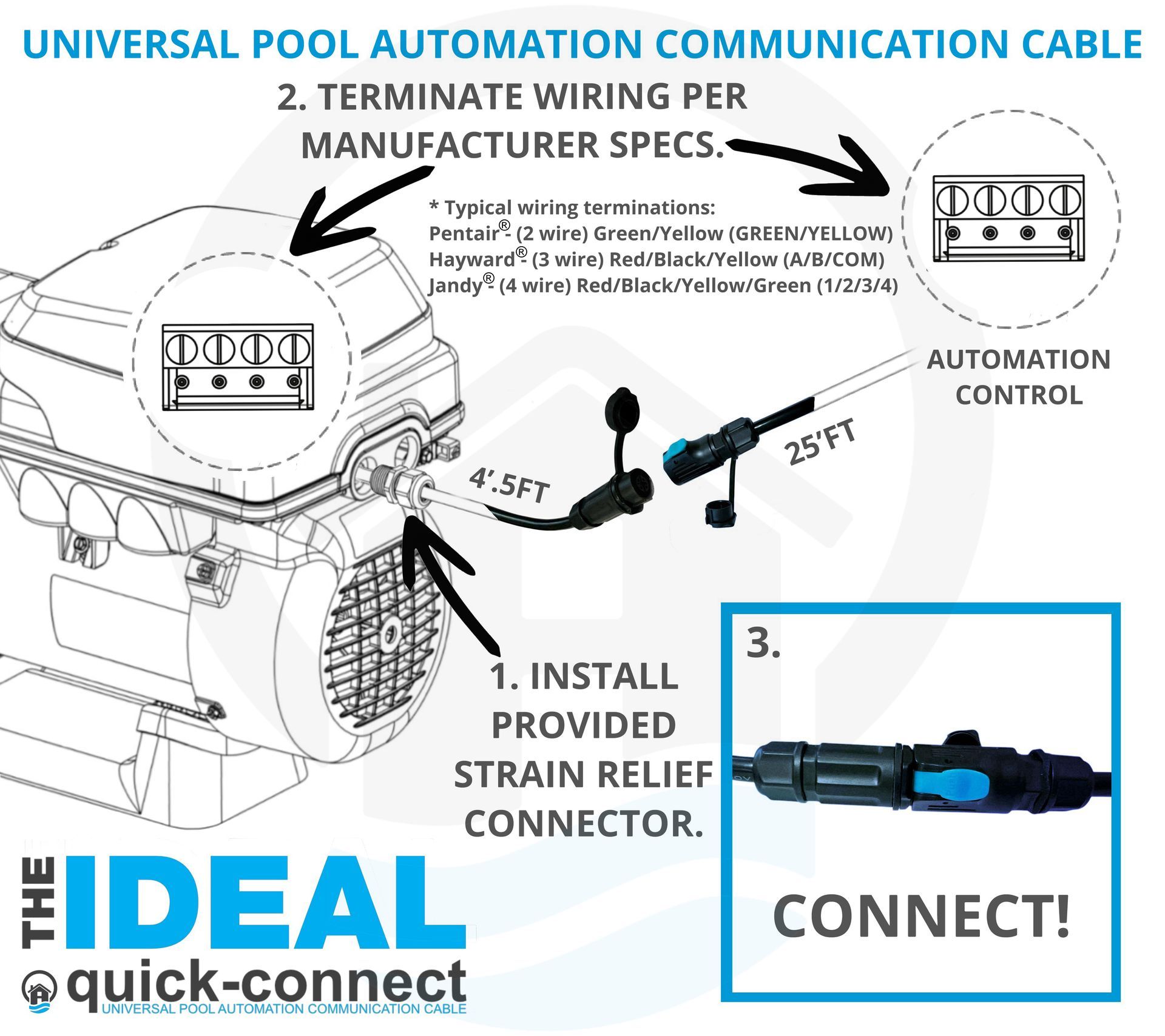 Being the first of its kind communication cable, this quick-connect design allows for anyone to easily remove a pool or spa pump with little to no expertise especially when paired with a twist lock cord outlet.